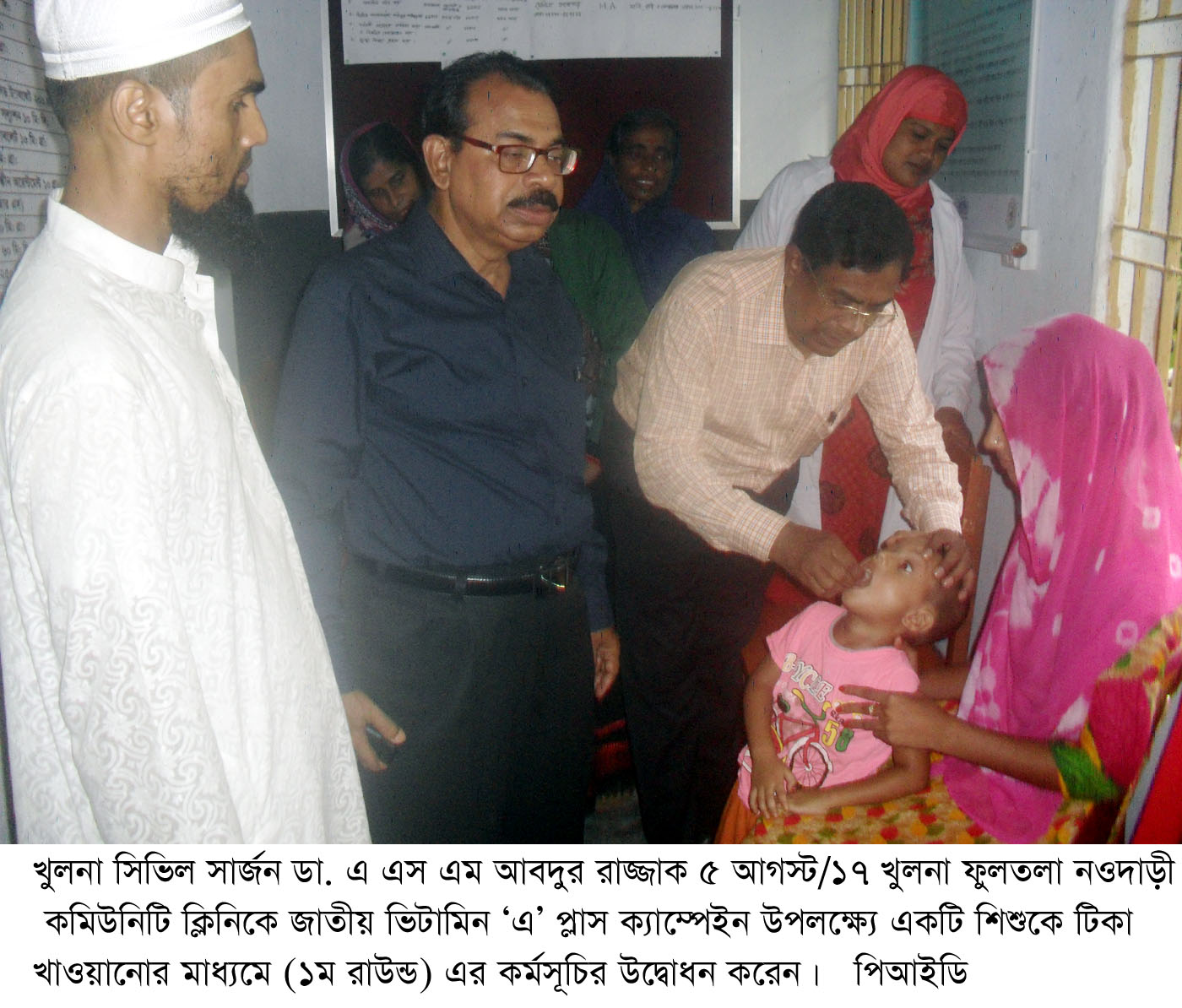 জাতীয় ভিটামিন ‘এ’ প্লাস ক্যাম্পেইন-২০১৭ উদযাপন উপলক্ষে আজ সকালে খুলনা ফুলতলা নওদাড়ী কমিউনিটি ক্লিনিকে একটি শিশুকে টিকা খাওয়ানোর মাধ্যমে (১ম রাউন্ড) এর উদ্বোধন করা হয়। এতে প্রধান অতিথি ছিলেন খুলনা সিভিল সার্জন ডা. এ এস এম আবদুর রাজ্জাক।