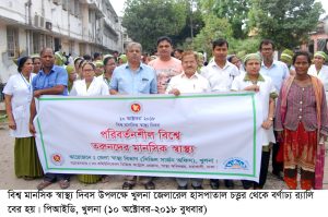 ‘পরিবর্তনশীল বিশ্বে তরুণদের মানসিক স্বাস্থ্য’ এ প্রতিপাদ্য নিয়ে আজ খুলনায় পালিত হয় বিশ্ব মানসিক স্বাস্থ্য দিবস-২০১৮। এ উপলক্ষে ১০ অক্টোবর সকালে খুলনা সিভিল সার্জন দপ্তরের উদ্যোগে জেনারেল হাসপাতাল চত্ত্বরে বর্ণাঢ্য র্যালির উদ্বোধন করেন খুলনার ভারপ্রাপ্ত সিভিল সার্জন ডাঃ মোঃ আতিয়ার রহমান শেখ।