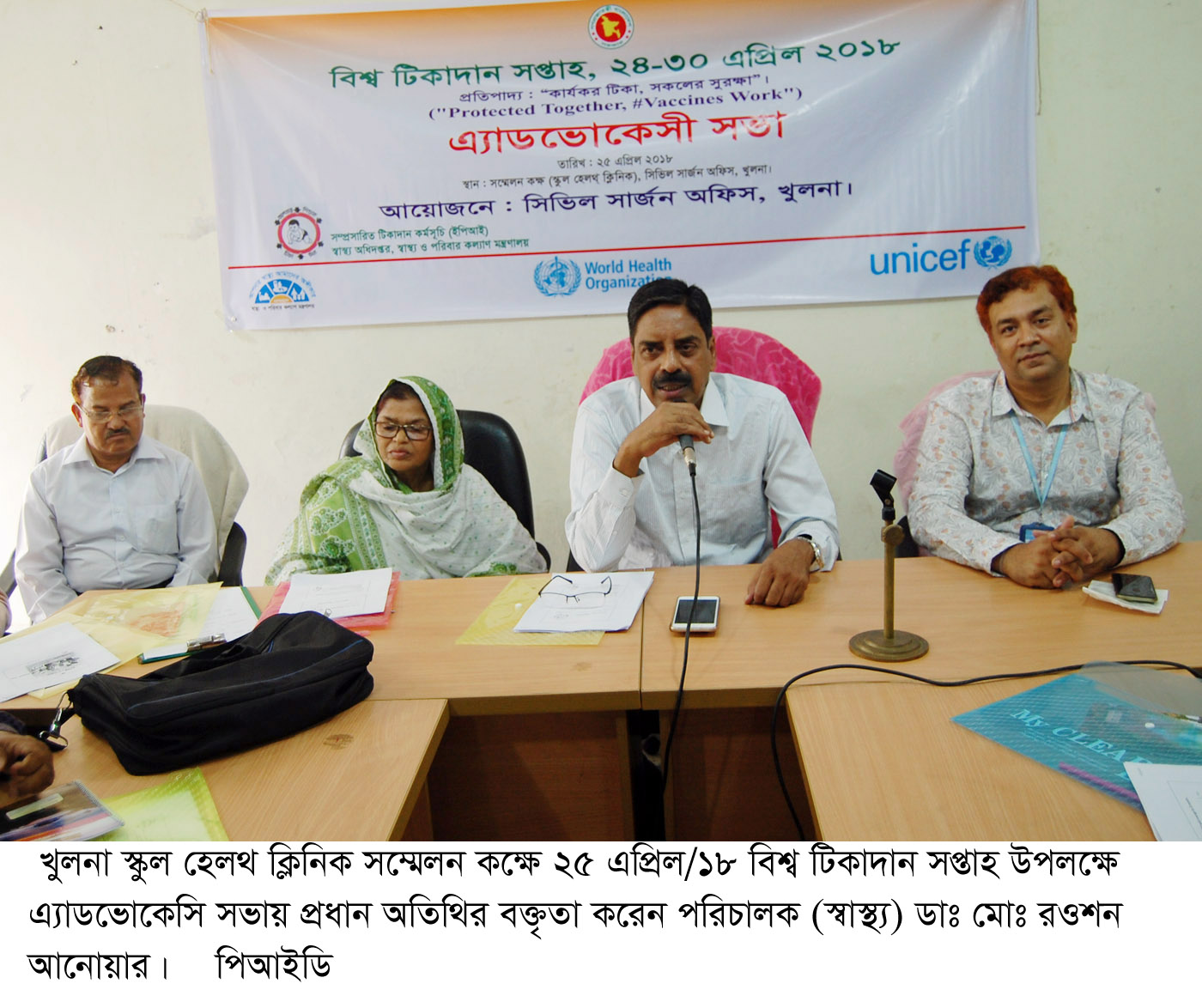 সভায় প্রধান অতিথির বক্তৃতায় খুলনা স্বাস্থ্য বিভাগের পরিচালক ডাঃ মোঃ রওশন আনোয়ার বলেন, বিশ্ব টিকাদান সপ্তাহের মূল উদ্দেশ্য হচ্ছে, বাদপড়া সকল শিশুর টিকা প্রাপ্তি নিশ্চিত করা। এজন্য জনসচেতনতা বাড়ানোর পাশাপাশি স্বাস্থ্যকর্মীদের আরও সক্রিয় ভূমিকা পালন করতে হবে। টিকা প্রদানের সুফল এবং টিকা দেয়া না হলে কী ধরণের ক্ষতির সম্মুখীন হওয়ার আশঙ্কা রয়েছে তা শিশুর অভিভাবককে বুঝাতে হবে।