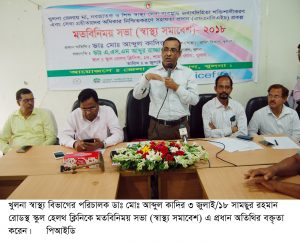 খুলনা জেলায় মা, নবজাতক ও শিশু স্বাস্থ্যসেবা ব্যবস্থায় জবাবদিহিতা শক্তিশালীকরণ এবং সেবাগ্রহীতাদের অধিকার নিশ্চিতকরণে সহায়তা প্রদান (এমএনসিএইচ) প্রকল্প মতবিনিময় সভা (স্বাস্থ্য সমাবেশ) আজ সকালে খুলনা সামছুর রহমান রোডস্থ স্কুল হেলথ ক্লিনিকে অনুষ্ঠিত হয়।
