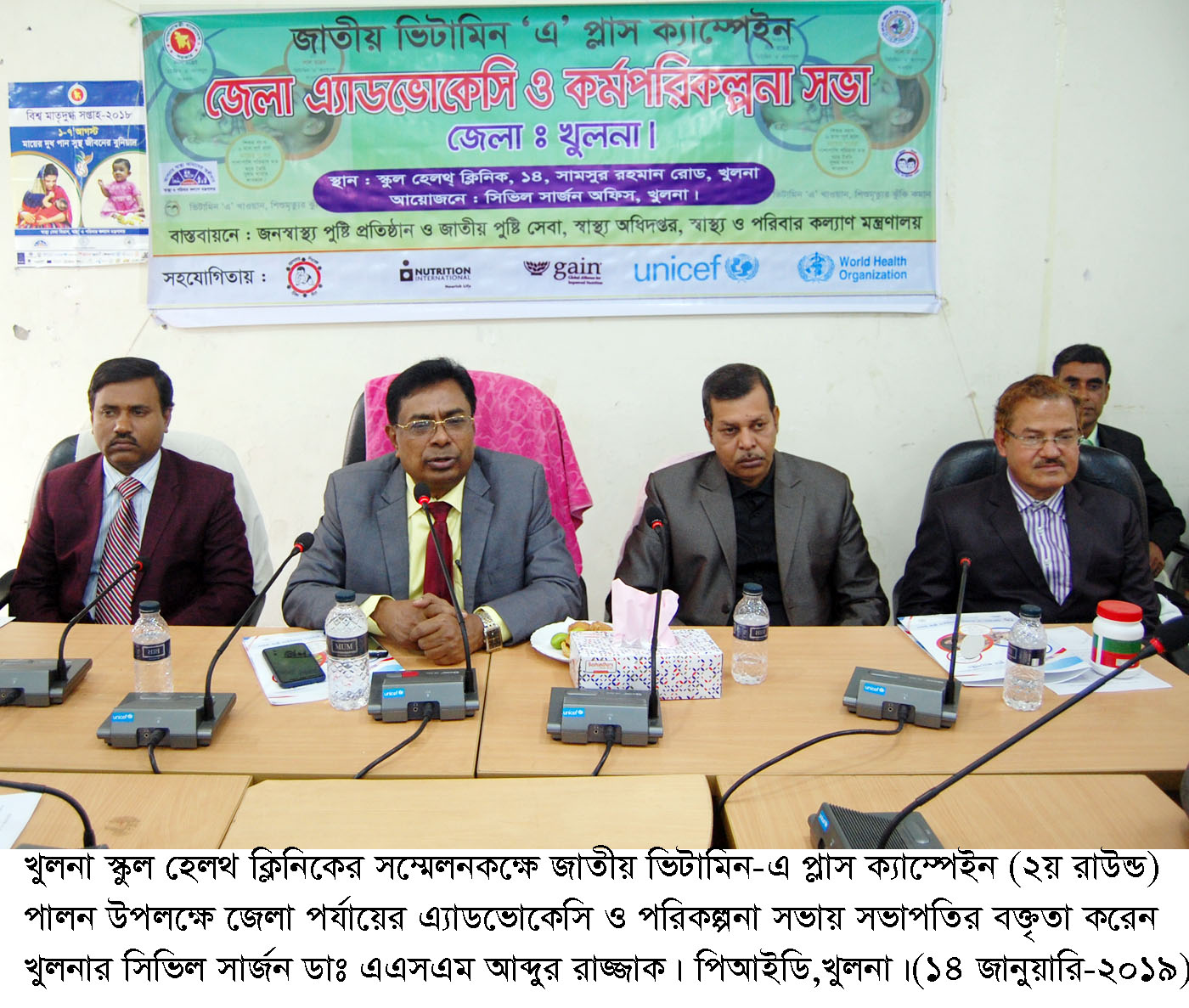 সোমবার সকালে খুলনা সামছুর রহমানস্থ স্কুল হেলথ ক্লিনিকের সম্মেলনকক্ষে জেলা পর্যায়ের এ্যাডভোকেসি ও পরিকল্পনা সভায় এ তথ্য জানানো হয়। জাতীয় ভিটামিন-এ প্লাস ক্যাম্পেইন (২য় রাউন্ড) পালন উপলক্ষে খুলনা সিভিল সার্জন দপ্তর এই সভার আয়োজন করে।