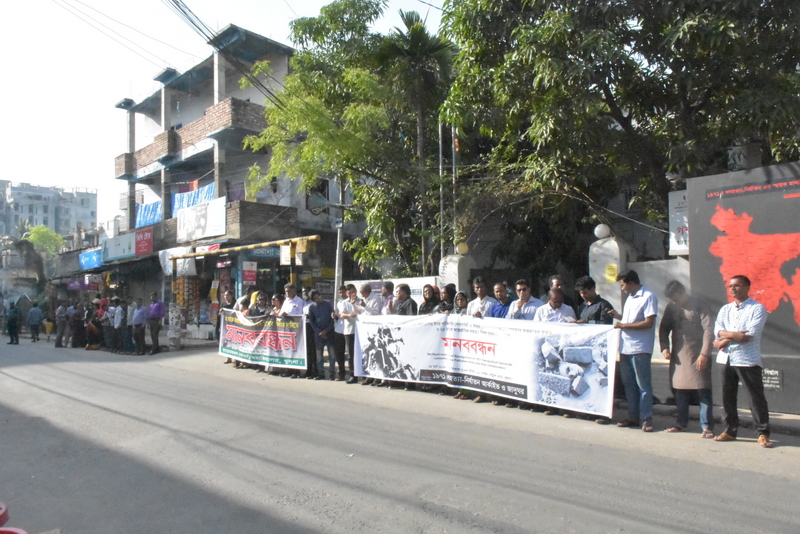 অনুষ্ঠানের শুরুতেই জাদুঘরের সামনে ২৫ মার্চের গণহত্যাকে আন্তর্জাতিক স্বীকৃতি ও আন্তর্জাতিক গণহত্যা দিবস ঘোষনার দাবীতে মানববন্ধন অনুষ্ঠিত হয়। মানববন্ধন শেষে অতিথিরা আলোচনা অনুষ্ঠানে অংশগ্রহণ করে একাত্তরের গণহত্যা ও তার আন্তর্জাতিক স্বীকৃতির বিষয়ে কথা বলেন।