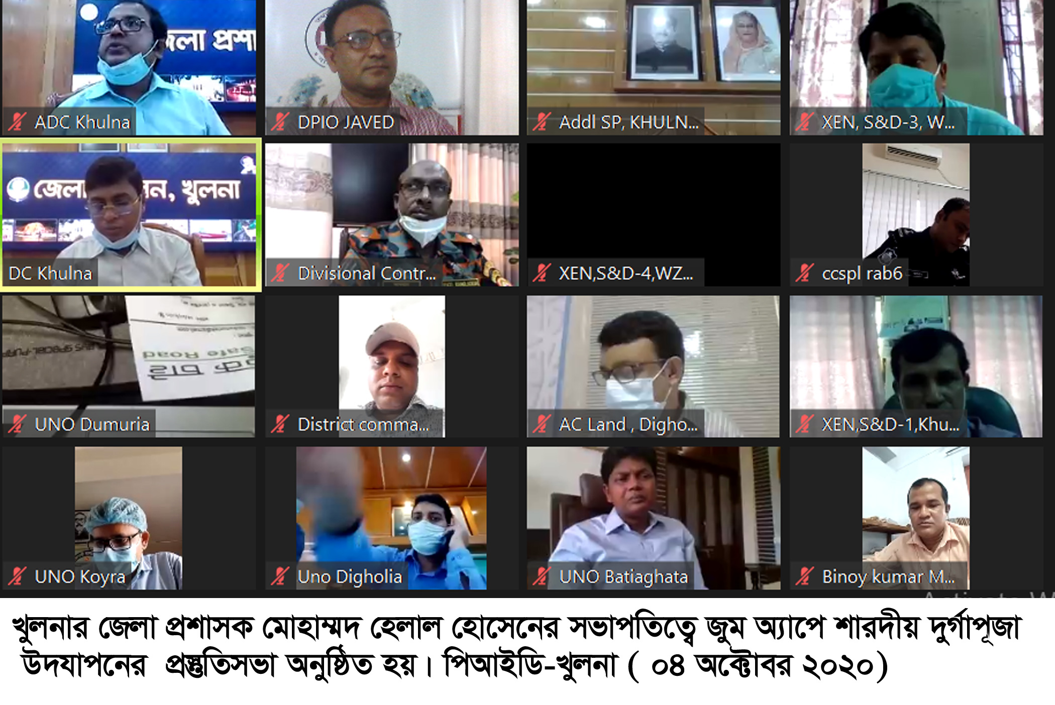 খুলনায় শারদীয় দুর্গাপূজা সুষ্ঠুভাবে উদযাপনের লক্ষ্যে এক প্রস্তুতিসভা আজ (রবিবার) সকালে অনলাইন জুম প্রযুক্তিতে অনুষ্ঠিত হয়। খুলনা জেলা প্রশাসক মোহাম্মদ হেলাল হোসেন তাঁর সম্মেলনকক্ষ হতে যুক্ত হয়ে সভায় সভাপতিত্ব করেন।