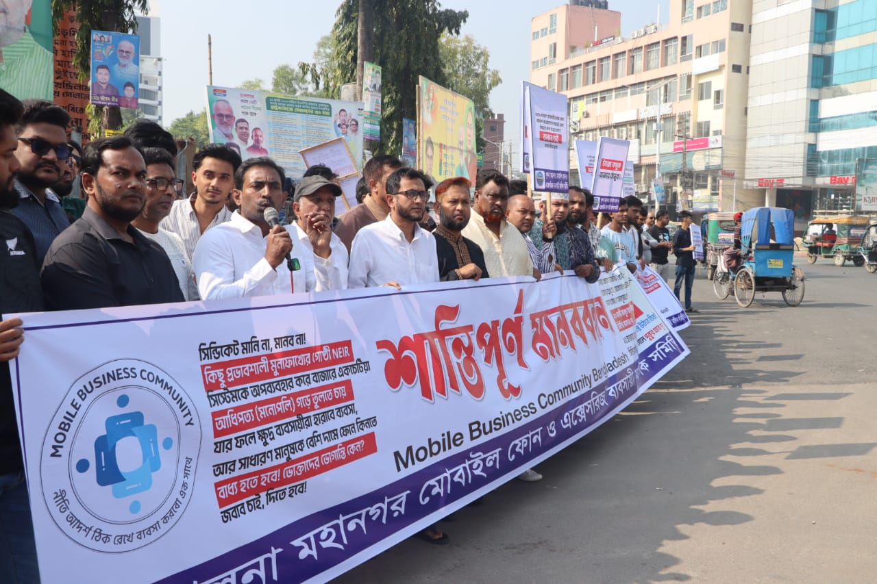 সোমবার (২৪ নভেম্বর) সকাল থেকে দোকান বন্ধ রেখে মহানগরীর প্রাণকেন্দ্র শিববাড়ির মোড়ে খুলনা মহানগর মোবাইল ফোন ও অ্যাক্সেসরিজ ব্যবসায়ী মালিক সমিতির উদ্যোগে মানববন্ধন করেন তারা।