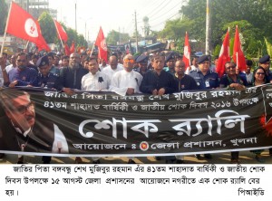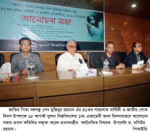 উপদেষ্টা আজ সকালে খুলনা বিশ্ববিদ্যালয়ের ১নং একাডেমিক ভবন মিলনায়তনে জাতির জনক বঙ্গবন্ধু শেখ মুজিবুর রহমানের ৪১তম শাহাদাৎ বাষির্কী ও জাতীয় শোক দিবস উপলক্ষে আলোচনায় প্রধান অতিথির বক্তৃতায় একথা বলেন।