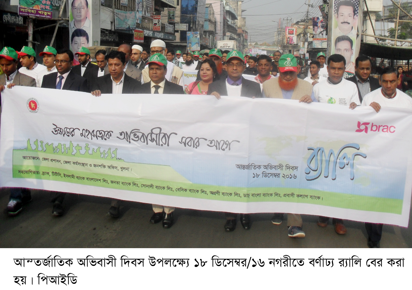 `উন্নয়নের মহাসড়কে অভিবাসীরা সবার আগে’ প্রতিপাদ্য নিয়ে খুলনায় আজ নানা আয়োজনে পালিত হয় আন্তর্জাতিক অভিবাসী দিবস ২০১৬। দিবসটি পালন উপলক্ষে খুলনা জেলা প্রশাসন এবং জেলা কর্মসংস্থান ও জনশক্তি অফিসের যৌথ আয়োজনে গৃহীত কর্মসূচীর মধ্যে ছিল র্যালি, আলোচনা সভা, প্রবাসীদের মেধাবী সন্তানদের মাঝে শিক্ষাবৃত্তির চেক প্রদান, চিত্রাঙ্কন প্রতিযোগিতা ও প্রীতি ফুটবল প্রতিযোগিতা।
