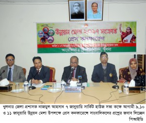 সংবাদ সম্মেলনে জেলা প্রশাসক জানান, ৯ থেকে ১১ জানুয়ারি খুলনায় অনুষ্ঠিত হতে যাচ্ছে উন্নয়ন মেলা। এতে খুলনার বিভিন্ন সরকারি ও বেসরকারি দপ্তরের বিগত ৮ বছরে সরকারের গৃহীত বহুমুখী উন্নয়ন কার্যক্রম তুলে ধরা হবে। খুলনার সার্কিট হাউজ ময়দানে প্রতিদিন সকাল ১০টা থেকে রাত ৮টা পর্যন্ত মেলা চলবে। জেলা প্রশাসক বলেন, ২০২১ সালের মধ্যে দারিদ্র্যমুক্ত মধ্যম আয়ের দেশ গড়ার অঙ্গীকার পূরনে ইতোমধ্যে সরকারি-বেসরকারি দপ্তরের গৃহীত উন্নয়ন কার্যক্রমের প্রচারণার লক্ষ্যে এ মেলা আয়োজিত হতে যাচ্ছে। এই আয়োজনের মধ্যদিয়ে একইসাথে ঐতিহ্য মন্ডিত খুলনাকে শিল্পনগরী হিসেবে পরিচিত করার উদ্যোগ নতুন করে শুরু করা হবে।