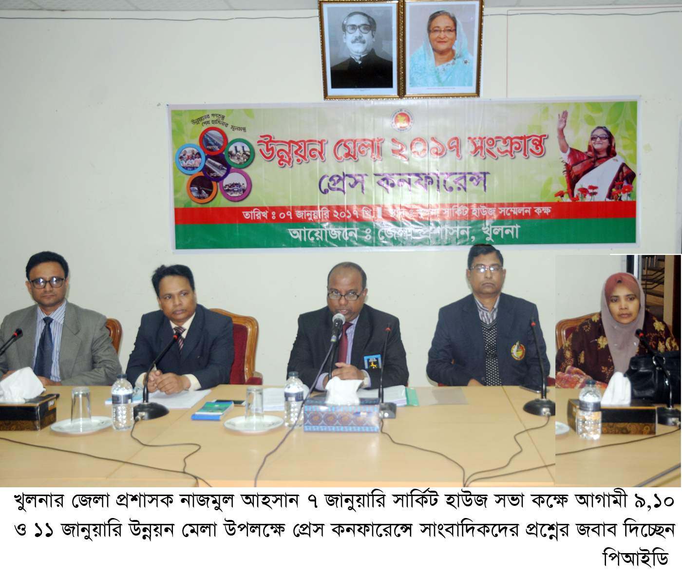উন্নয়ন মেলা-২০১৭ আয়োজন উপলক্ষে খুলনা জেলা প্রশাসন ও পিআইডি’র উদ্যোগে সার্কিট হাউজ সম্মেলন কক্ষে আজ এক সংবাদ সম্মেলনের আয়োজন করা হয়। খুলনা জেলা প্রশাসক নাজমুল আহসান উপস্থিত সাংবাদিকদের সামনে মেলা সম্পর্কে বিস্তারিত বলেন।