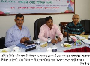 কেসিসি নির্বাচন উপলক্ষে ভিজিল্যান্স ও অবজারভেশন টিমের সভা আজ আঞ্চলিক নির্বাচন অফিসার মোঃ ইউনুচ আলীর সভাপতিত্বে নির্বাচন অফিস সম্মেলন কক্ষে অনুষ্ঠিত হয়।