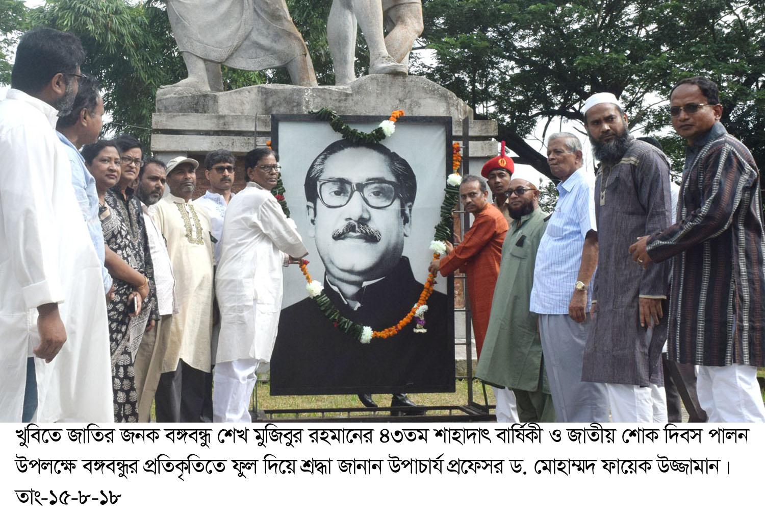 এরপর খুলনা বিশ্ববিদ্যালয় শিক্ষক সমিতি, স্বাধীনতা শিক্ষক পরিষদ, বঙ্গবন্ধু পরিষদ খুবি শাখা, অফিসার্স কল্যাণ পরিষদ, কর্মচারীরা, বিভিন্ন ডিসিপ্লিন, ছাত্রদের বিভিন্ন সংগঠন বঙ্গবন্ধুর প্রতিকৃতিতে পুষ্পমাল্য অর্পণ করে। শ্রদ্ধাঞ্জলি অর্পনের পর উপাচার্য আইন ডিসিপ্লিন কর্তৃক পনেরই আগস্ট উপলক্ষ্যে প্রকাশিত স্মরণিকা ‘অগ্নিগিরির অস্তাচলে’ এর মোড়ক উন্মোচন করেন। পরে তিনি আচার্য্য জগদ্বীশচন্দ্র বসু একাডেমিক ভবনে ২য় তলায় বঙ্গবন্ধুর ওপর আলোকচিত্র প্রদর্শনীর উদ্বোধন করেন।