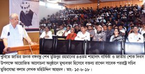অনুষ্ঠানে মুখ্য আলোচক হিসেবে বক্তব্য রাখেন সাবেক পররাষ্ট্র সচিব, মুক্তিযোদ্ধা ও কলাম লেখক মহিউদ্দিন আহমদ। তিনি তাঁর দীর্ঘ কূটনৈতিক জীবনে বঙ্গবন্ধুকে কাছ থেকে দেখার সৌভাগ্য নিয়ে বিভিন্ন স্মৃতি ও ঘটনা এবং অবসরের পর এই দীর্ঘ ৭৭ বছর বয়সের নানা অভিজ্ঞতা তুলে ধরে এক ঘন্টারও বেশি সময় বক্তব্য রাখেন। তিনি বলেন পেশাদার কূটনীতিক হিসেবে দুনিয়ার অনেকগুলো দেশে দায়িত্ব পালন করেছি। এসময় অনেক রাজা-বাদশা-প্রেসিডেন্ট প্রাইমমিনিস্টারকে কাছে থেকে দেখার সৌভাগ্য হয়েছে। দ্বিপক্ষীয় বা বহুপাক্ষিক আলোচনায়, কথা-বার্তায়, সৌজন্য প্রকাশে তাদের ঘনিষ্ঠভাবেও দেখেছি। কিন্তু বঙ্গবন্ধু শেখ মুজিবুর রহমানের মতো এমন সাহসী, প্রজ্ঞা ও বলিষ্ঠ নেতৃত্ব, মাটি ও মানুষের প্রতি এমন মমত্ববোধ, দেশপ্রেম আমি কোথাও কারও মধ্যে দেখেনি। বঙ্গবন্ধু পাকিস্তানের বন্দীঅবস্থা থেকে মুক্ত হয়ে রাওয়ালপিন্ডি থেকে ১৯৭২ সালের ৮ জানুয়ারি লন্ডনে পৌঁছান। এই দিন ভোরে লন্ডনের হীথ্রো বিমানবন্দরে যে তিনজন বাঙালি কূটনীতিকের মুক্ত বঙ্গবন্ধুকে অভ্যর্থনা জানানোর সুযোগ ও সৌভাগ্য হয়েছিল তার মধ্যে তিনিও একজন ছিলেন বলে উল্লেখ করে সেদিনের সেই অবিস্মরণীয় মুহূর্তের স্মৃতি এবং বিশ্বের তিনশত সাংবাদিকের উপস্থিতিতে প্রেস কনফারেন্সসহ বিভিন্ন তৎপরতার কথা তুলে ধরেন। সেদিন ব্রিটিশ প্রধানমন্ত্রী এডওয়ার্ড হীথ যে সম্মান বঙ্গবন্ধুকে দেখিয়েছিলেন তা আর কোথাও তিনি দেখিনি। তাঁর ধারণা আর কেউও কোথাও দেখেননি। প্রসঙ্গক্রমে তিনি বলেন লন্ডনে ব্রিটিশ সরকার এবং জনগণকে ৭১এ আমাদের মুক্তিযুদ্ধকে প্রত্যক্ষ এবং পরোক্ষ সমর্থন জানানোর জন্য ধন্যবাদ ও কৃতজ্ঞতা জানাতে বঙ্গবন্ধু গিয়েছিলেন ব্রিটিশ প্রধানমন্ত্রীর সরকারী বাসভবন ১০ নম্বর ডাউনিং স্ট্রীটে। আলোচনা শেষে বঙ্গবন্ধু যখন তাঁর হোটেলে ফিরে আসছিলেন, তখন বঙ্গবন্ধুকে সাথে নিয়ে প্রথা ভেঙ্গে ডাউনিং স্ট্রীটের বাইরে এসে ব্রিটিশ প্রধানমন্ত্রী রোলস রয়েস গাড়ির দরজা খুলে দাঁড়িয়ে থাকেন যাতে বঙ্গবন্ধু গাড়িতে উঠতে পারেন। তিনি আরও বলেন লন্ডন থেকে দেশে ফেরার পর তাঁর সফল পররাষ্ট্রনীতি ও কূটনৈতিক তৎপরতার কারণে খুব অল্পদিনের মধ্যেই পৃথিবীর প্রায় সব দেশই স্বাধীন ও সার্বভৌম বাংলাদেশকে স্বীকৃতি দেয়। সারা বিশ্ব বঙ্গবন্ধুকে মহান নেতা হিসেবে শ্রদ্ধা জানিয়েছে। হাজার বছরের মধ্যে বাঙালি জাতিকে পরাধীনতার শৃঙ্খল থেকে মুক্ত করে যিনি আমাদের একটি স্বাধীন ও সার্বভৌম দেশ উপহার দিয়েছেন পনেরই আগস্ট সেই জাতির জনককে কিছু বিশ্বাস ঘাতক নৃশংসভাবে সপরিবারে হত্যা করে। দেশ ও জাতির জন্য এর চেয়ে বড় দুর্ভাগ্যের আর কী হতে পারে? বাঙালি জাতির এ ক্ষতি আর কোনোদিন পুরণ হওয়ার নয