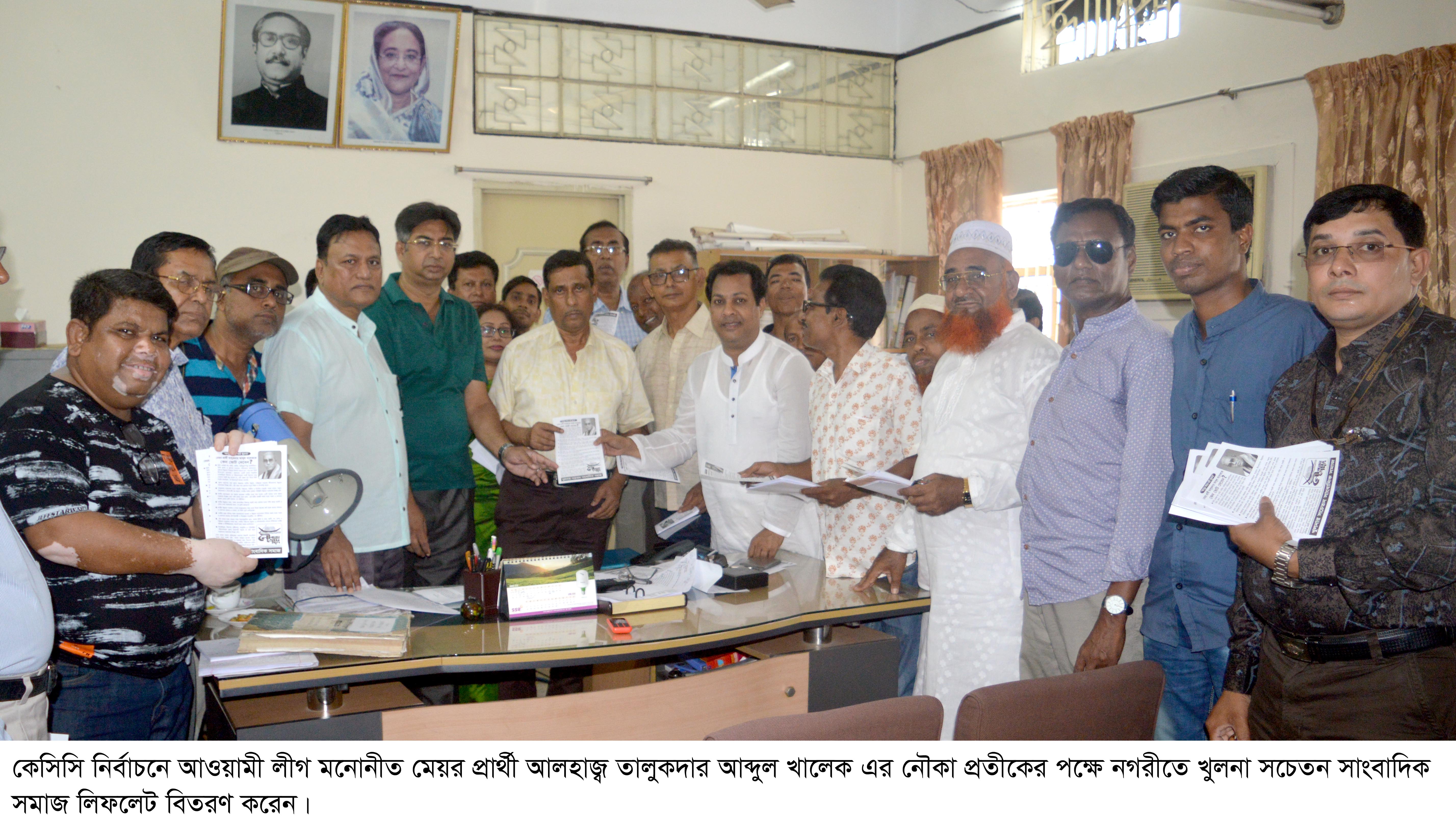 খুলনা সিটি কর্পোরেশন (কেসিসি) নির্বাচনে আওয়ামী লীগ মনোনীত মেয়র প্রার্থী আলহাজ্ব তালুকদার আব্দুল খালেক এর নৌকা প্রতীকের পক্ষে সচেতন সাংবাদিক সমাজ নগরীতে ব্যাপক গণসংযোগ ও প্রচারপত্র বিতরণ করেছেন।