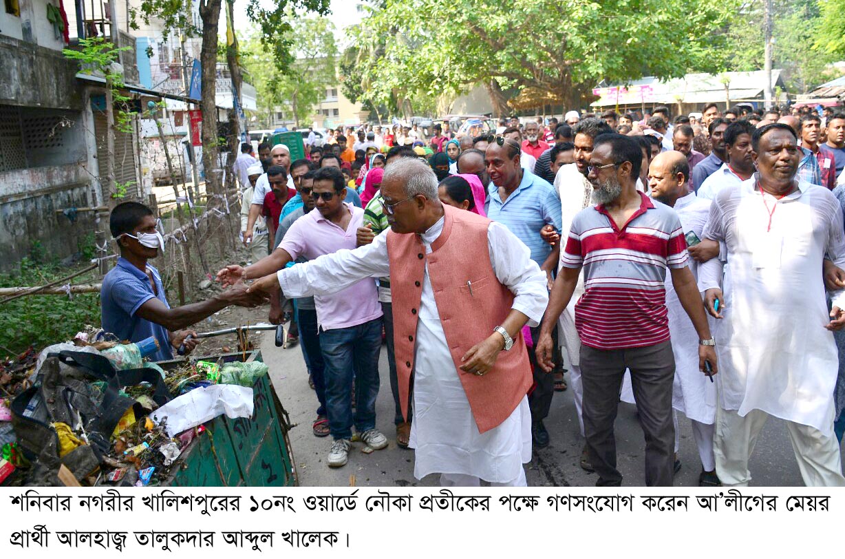 আওয়ামী লীগ মেয়র প্রার্থী তালুকদার আব্দুল খালেক আজ শনিবার সকাল ৮টায় নগরীর খালিশপুর থানাধীন ১০নং ওয়ার্ডে গণসংযোগ ও সুধীজনদের সঙ্গে মতবিনিময়কালে এ কথা বলেন। আওয়ামী লীগ মেয়র প্রার্থী বলেন, বিএনপি-জামায়াত জোটের শাষনামলে খুলনাকে মৃত নগরীতে পরিনত করছিল। একের পর এক শিল্প প্রতিষ্ঠান বন্ধ করে দিয়ে শ্রমিকদের বেকার করেছে। শেখ হাসিনা ক্ষমতায় এসে বন্ধ মিল-কল কারখানা চালুসহ শ্রমিকরা যাতে সুখে শান্তিতে থাকতে পারেন সে ব্যাপারে কাজ করে যাচ্ছেন। নির্বাচিত হলে খুলনা মহানগরীর জলাবদ্ধতা নিরসন ও মাদকমুক্ত একটি আধুনিক পরিচ্ছন্ন নগরী গড়ে তোলার প্রতিশ্রুতি পুনর্ব্যক্ত করেন তালুকদার আব্দুল খালেক।