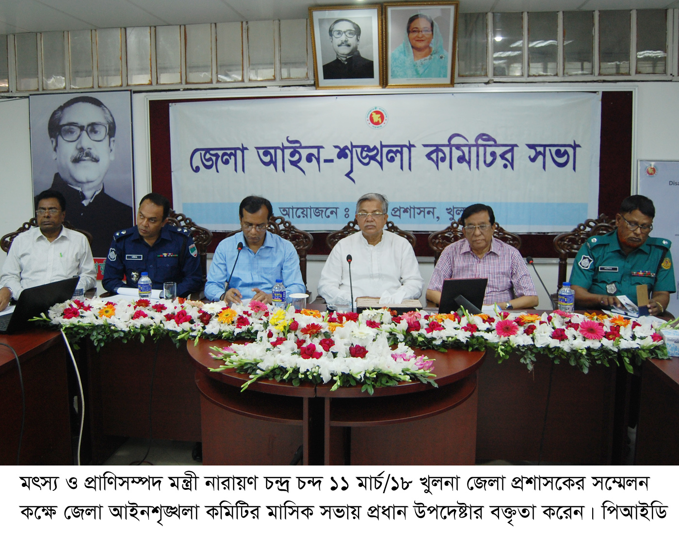 মৎস্য ও প্রাণিসম্পদ মন্ত্রী নারায়ণ চন্দ্র চন্দ বলেছেন, যে কোন মূল্যে আইনশৃঙ্খলা পরিস্থিতি স্বাভাবিক রাখতে হবে। দেশের অন্যান্য স্থানের তুলনায় এ অঞ্চলের আইনশৃঙ্খলা পরিস্থিতি অনেক ভাল অবস্থানে রয়েছে।