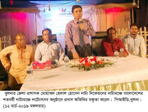 প্রধান অতিথি জেলা প্রশাসক মোহাম্মদ হেলাল হোসেন বলেন, দেশে থেকে প্রায় নাটক হারিয়ে যেতে বসেছে। এই ঐতিহ্যকে ফিরিয়ে আনতে মানসম্মত নাটক তৈরি করতে হবে। নাটকের মাধ্যমে সমাজের ভাল এবং খারাপ দিকগুলো তুলে ধরতে পারে। তিনি বলেন, খুলনা জেলা শিল্প-সংস্কৃতিতে দীর্ঘদিনের সুনাম রয়েছে। এই সুনাম আমাদের ধরে রাখতে হবে। একটি দেশের নিজস্ব সংস্কৃতি সে দেশের পরিচয় বহন করে। শুদ্ধ সংস্কৃতি চর্চা ও প্রতিভার বিকাশে জেলা শিল্পকলা একাডেমি গুরুত্বপূর্ণ ভূমিকা পালন করে যাচ্ছে।