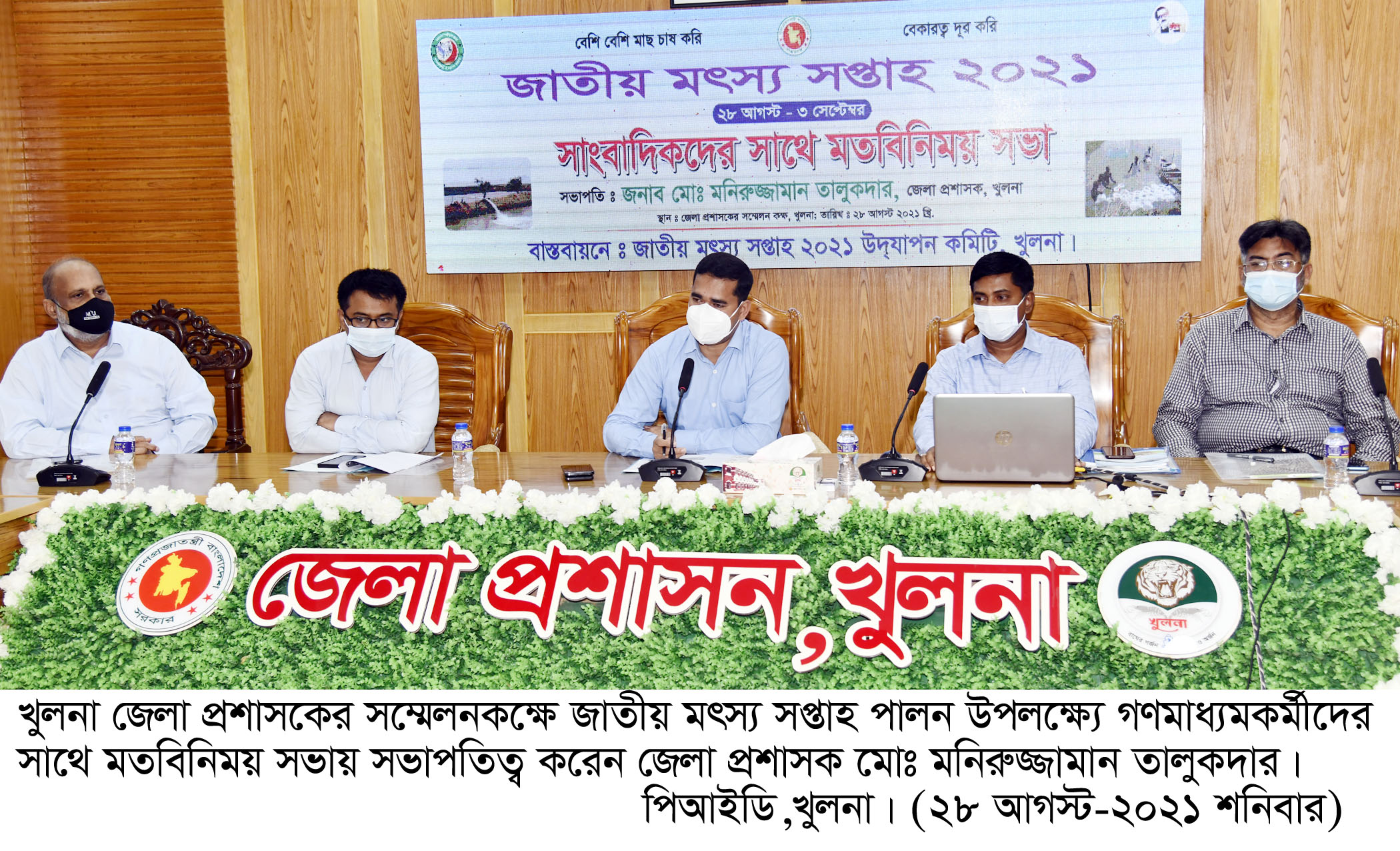 খুলনা জেলায় জাতীয় মৎস্য সপ্তাহ-২০২১ উদযাপন উপলক্ষ্যে আজ (শনিবার) দুপুরে জেলা প্রশাসক মোঃ মনিরুজ্জামান তালুকদারের সভাপতিত্বে জেলা প্রিশাসন সম্মেলনকক্ষে গণমাধ্যমকর্মীদের সাথে মতবিনিময় সভা অনুষ্ঠিত হয়।